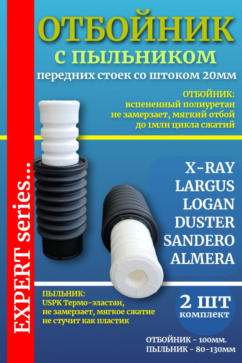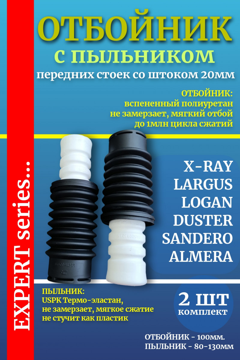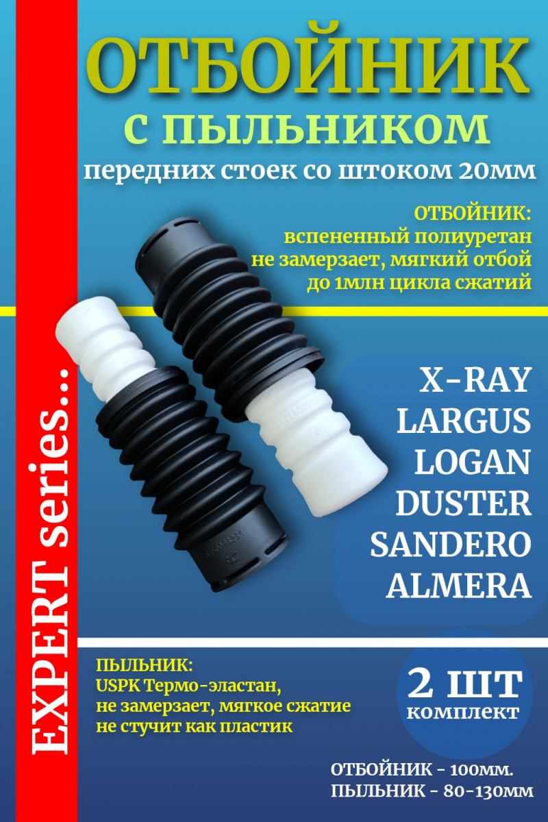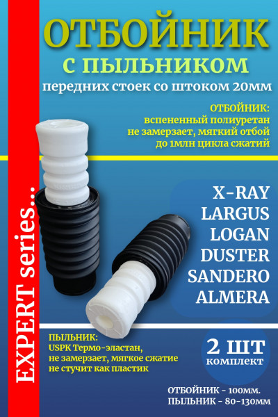 Профессиональный комплект отбойников из современного пенополиуретана с защитными пыльниками для передней подвески автомобилей Lada и Renault. Обеспечивает надёжную амортизацию ударных нагрузок и продлевает срок службы подвески.