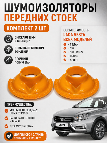 Шумоизоляторы на передние стойки под пружину из полиуретана на Лада Веста и Веста Кросс. Добавляют комфорта подвеске автомобиля, помогает бороться с шумами от мелких дорожных неровностей.
