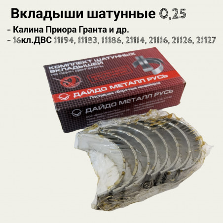 Вкладыши шатунные - 16v ваз 2170 приора калина гранта - двс 11186, 11189, 11194, 21116, 21126, 21127, 21129 - 0,25 ЗМЗ-Дайдо - комплект 8шт - 11194100010412